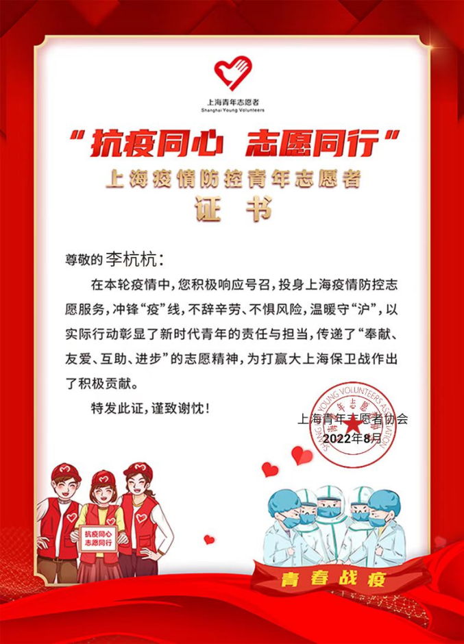 疫情期间,他参与家乡双庙社区的防疫志愿者,负责高速道口的疫情状况筛查,讲解防疫政策,协助防疫管理。在上海疫情防控工作中作为党员志愿者多次参与学校和学生宿舍的志愿服务工作,协助学校进行管理,同时也积极向社区街道报道,落实守土有责。多年来,校内外累计志愿时长达400多小时,多次获优秀志愿者和实践标兵称号。